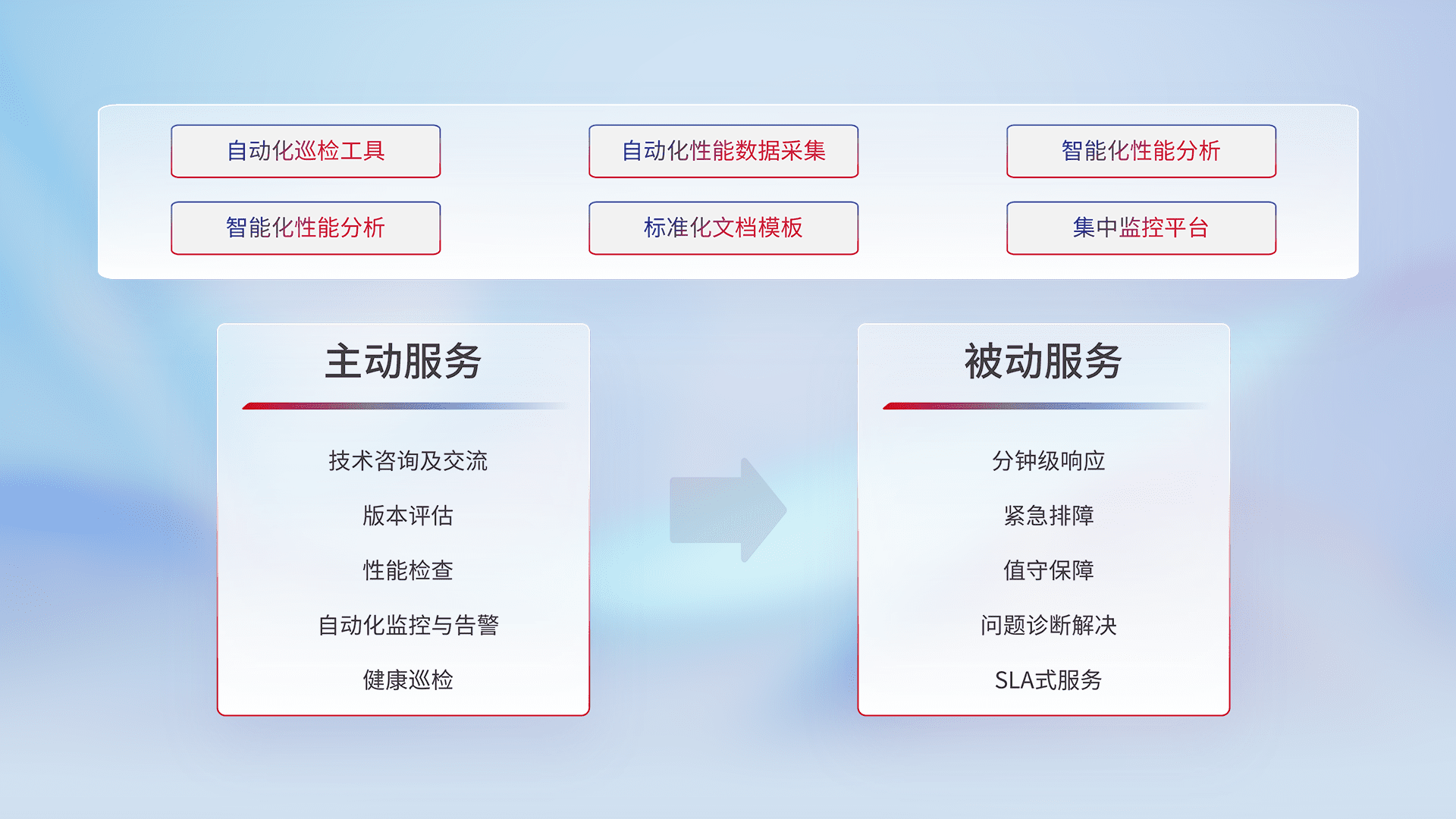 智能化工具和标准化文档,,,保障服务质量,,,,提供主动服务(包含技术咨询、、版本评估、、、性能检查、、、、自动化监控与告警、、健康巡检)和被动服务包含(分钟级响应、、、、紧急排障、、值守保障、、问题诊断解决、、、SLA服务)。。。。